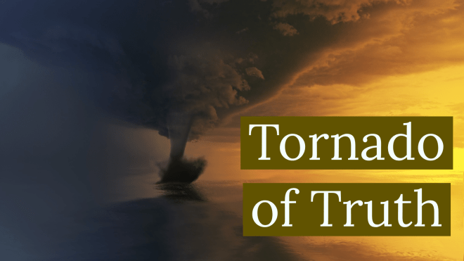 At 4:26 a.m. I may not have been a happy camper with a Tornado on the way, but I am glad to know as believers we hold a Tornado of Truth! And that truth is Jesus is on His way and we must be ready!