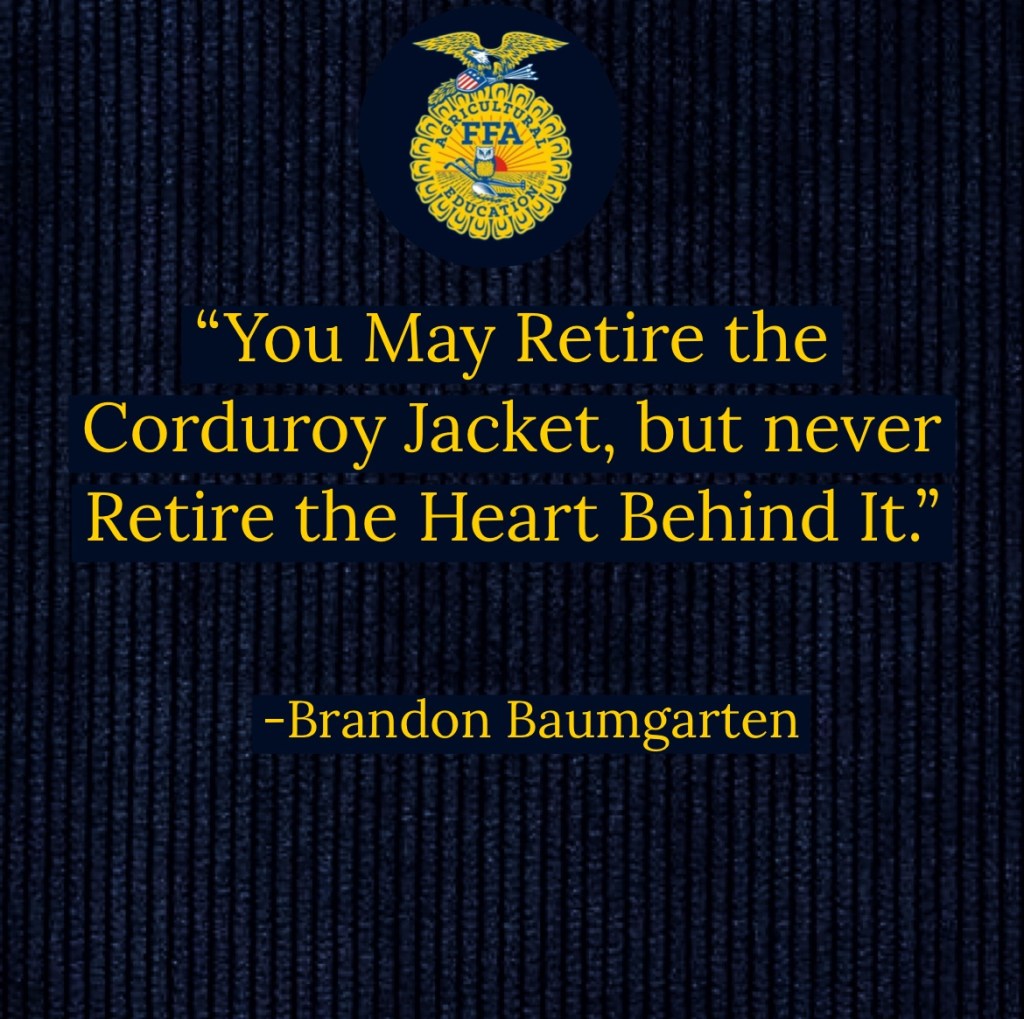 Then after the most intense moments of my life, I realized that my name….. wasn’t called. I wasn’t on the team and thus, the end of my time in FFA. I remember walking back to my hotel room and unzipping my jacket for the final time. I hung it up, never to wear it again. As I began to pack everything up, I could not help but reflect on the many positive memories I had in the organization and how it made me a better leader and team player. The positive difference my Ag Teacher made in my life and the many friendships I made throughout the way could not be more apparent to me. I realized that through my involvement in FFA, that the blue corduroy doesn’t change colors, but instead it changes lives. It certainly did for this FFA Has-Been and it will change yours too, if you let it!